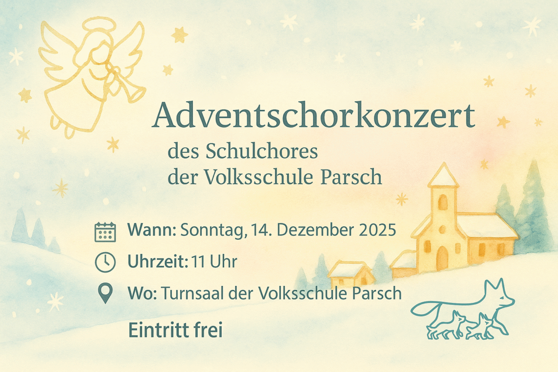 Adventschorkonzertdes Schulchoresder Volksschule Parsch Der Advent, die Vorbereitung auf Weihnachten, wird vom Schulchor der Volksschule Parsch, unter der Leitung von Gisela Plasser, mit Musik gefüllt. Lassen Sie sich von den fröhlichen, zauberhaften Stimmen der Chorkinder in eine festliche Adventsstimmung versetzen. Wann: Sonntag, 14. Dezember 2025Uhrzeit: 11 UhrWo: Turnsaal der Volksschule Parsch Der Eintritt ist frei!